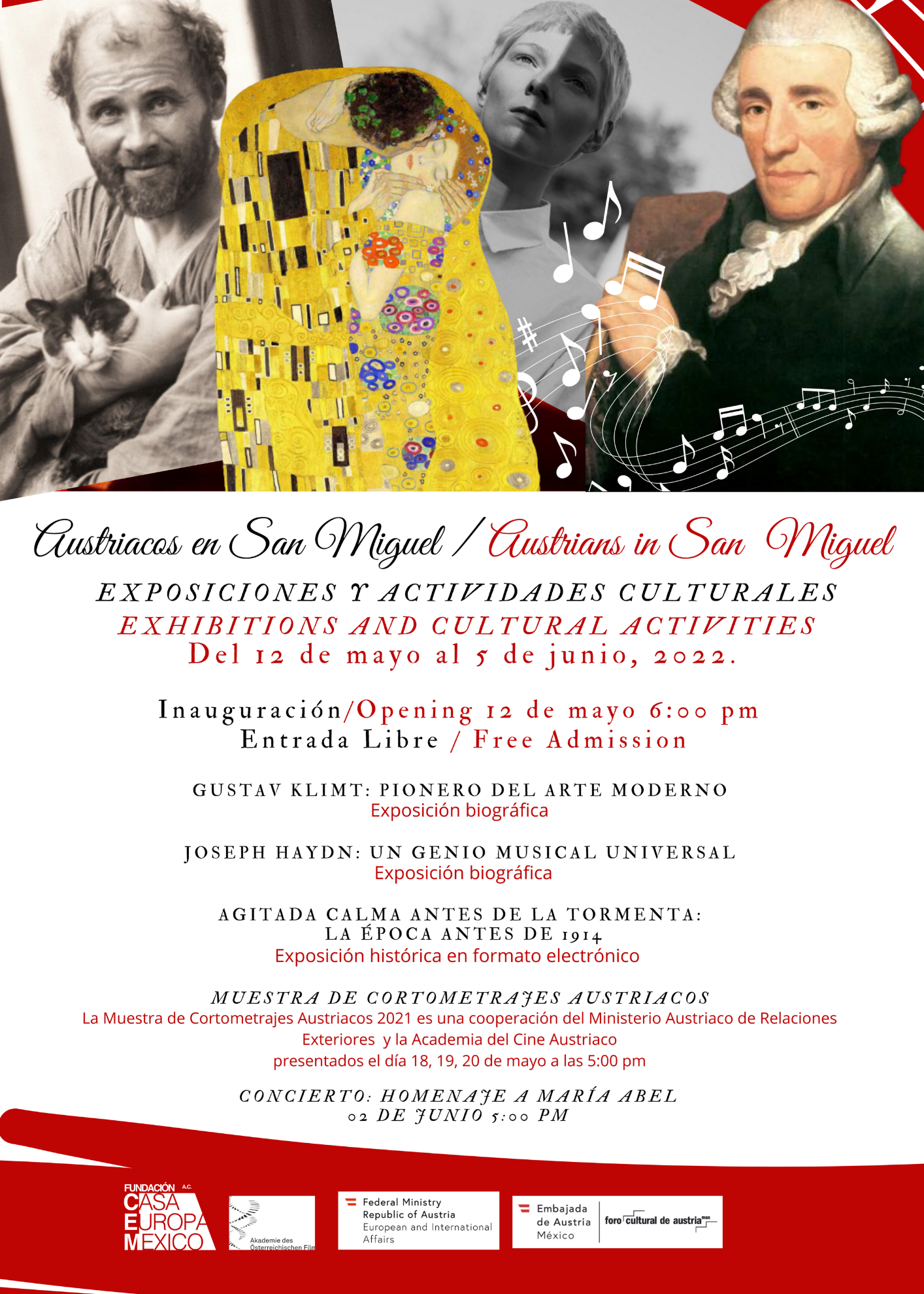 El mes de mayo se aproxima y grandes eventos llegan a Casa Europa México, con el propósito de seguir acercando a la población sanmiguelense la cultura europea, hemos logrado establecer una fructífera cooperación con la Embajada de Austria en México. Gracias al apoyo recibido por la Embajada de Austria y al Foro Cultural de Austria en México se estarán llevando a cabo diversas actividades culturales a lo largo del mes dentro de nuestras instalaciones denominadas “Austriacos en San Miguel” con la que se hace un reconocimiento a la vida y obra de grandes personajes originarios de Austria. Comenzamos el 12 de mayo a las 6:00 pm, será en esta fecha cuando se realizará un coctel de inauguración para las tres exposiciones que llegan a nuestra ciudad: GUSTAV KLIMT: PIONERO DEL ARTE MODERNO; Exposición biográfica que muestra fotografías e imágenes de sus obras. Gustav Klimt simboliza una época que hasta el día de hoy fascina y resuena: la época moderna. El artista dejó sus huellas, sobre todo en Viena, su trabajo caracterizó de forma determinante la época en torno a 1900. La Viena en la transición del siglo 19 al siglo 20, junto con París, Múnich y Londres, fue uno de los lugares del nacimiento de la época moderna. Artísticamente el trabajo de Gustav Klimt refleja de forma única el paso de la época historicista de la “Ringstraße” hasta los inicios del arte abstracto. AGITADA CALMA ANTES DE LA TORMENTA: LA ÉPOCA ANTES DE 1914; Exposición histórica en formato electrónico que trata acerca de los años previos a la Primera Guerra Mundial los cuales se suelen describir retrospectivamente como la calma antes de la tormenta. Austria vivió en aquella época una fase turbulenta en la que todos los ámbitos de la vida dieron un último gran paso hacia la Modernidad: Sigmund Freud investigó el inconsciente de nuestra existencia, las mujeres comenzaron a emanciparse, los sionistas anhelaron un Estado judío, la música abandonó los fundamentos de la armonía, mientras que la pintura se liberó fulminantemente del figurativismo. JOSEPH HAYDN: UN GENIO MUSICAL UNIVERSAL; Exposición documental itinerante acerca de la vida y obra del compositor Joseph Haydn, La exposición muestra eventos históricos de importancia de la época de Haydn por medio de un diagrama de tiempos. Además, para los días 18, 19 y 20 de mayo a las 5 pm se proyectarán en nuestro patio central la muestra de cortometrajes austriacos 2021, la entrada es libre y sin costo, recomendada para mayores de edad, con subtítulos en español. Y para cerrar con broche de oro este mes de actividades culturales, el día 2 de junio a las 6:00 pm se realizará un concierto de música clásica sin costo, como un homenaje póstumo a una gran austriaca quien fue residente de nuestra ciudad y que tanto aporto a la promoción de la cultura: María Abel, en dicho homenaje contaremos con la presencia de la Excelentísima Embajadora de Austria Dra. Elisabeth Kehrer, como muestra de su gran apoyo a esta exposición y a los fuertes vínculos entre México y Austria. Texto adaptado por Rosalba Márquez