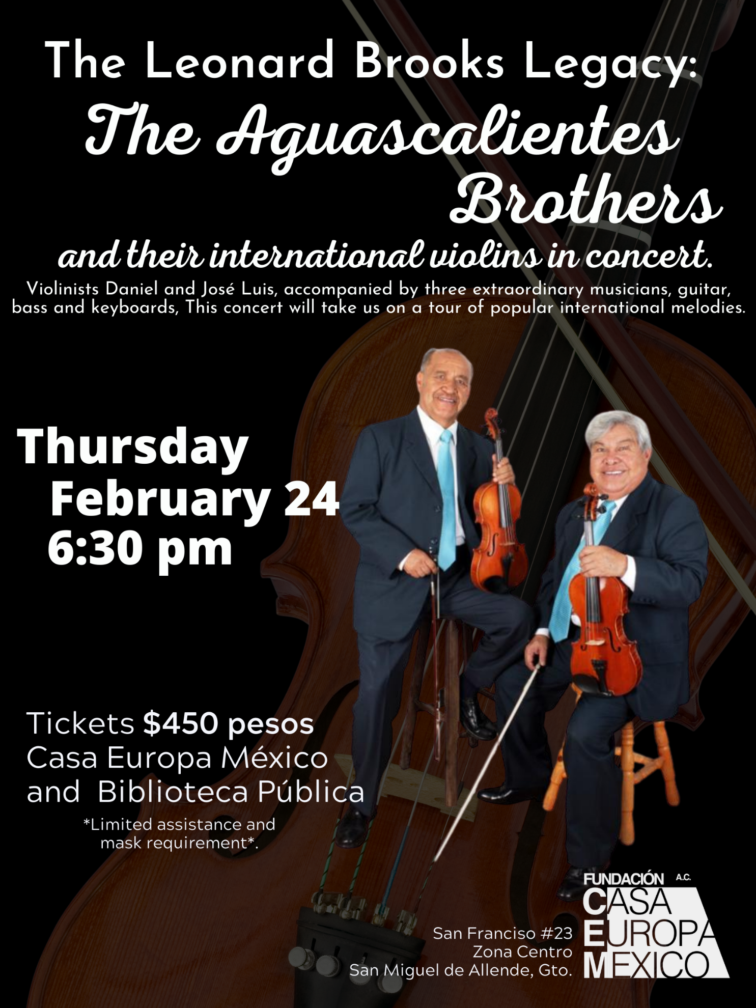 During the month of February, Casa Europa exhibits the works of the renowned artist Leonard and Reva Brooks, but, Did you know their musical contribution to the city? In 1962 the Mexican government asked Leonardo to become the founding director of the Music Department of the new School of Fine Arts in San Miguel de Allende, Guanajuato, which he would be in charge of for 25 years. During that period and in total for almost 40 years, Leonard donates his salary to provide musical instruments to his students, among these students were the children who would later form the group called: The Aguascalientes Brothers. The Aguascalientes Brothers were originally from San Miguel de Allende, Gto. They were graduates of the Ignacio Ramírez ''El Nigromante'' Cultural Center, National Institute of Fine Arts, where they were students of the late artist Leonard Brooks. Mr. Brooks was the founder of the first school music in San Miguel de Allende. During their extended career Daniel and José Luis were members of the Symphony Orchestra of the University of Guanajuato, The Chamber Orchestra of the University of Guanajuato, the Tuna de Oro de Guanajuato and the State Band for many years. They also participated in the orchestra that accompanied the international organist Juan Torres and his melodic organ. In 1977 they formed the current ensemble. After more than four decades the artistic work of this group plays an important role in the musical field of Mexico. Their extensive repertoire incorporates music from many parts of the world, which they have performed on numerous important stages in Mexico, North, Central, South America and Europe. The Aguascalientes Brothers have received multiple awards from prestigious cultural institutions for their extraordinary musical achievements. This is their 43rd year of performing as the Aguascalientes Brothers ensemble. Today the violinists, Daniel and José Luis, will be accompanied by their outstanding colleagues on guitar, bass and keyboard. This concert will take us on a tour of popular international melodies.