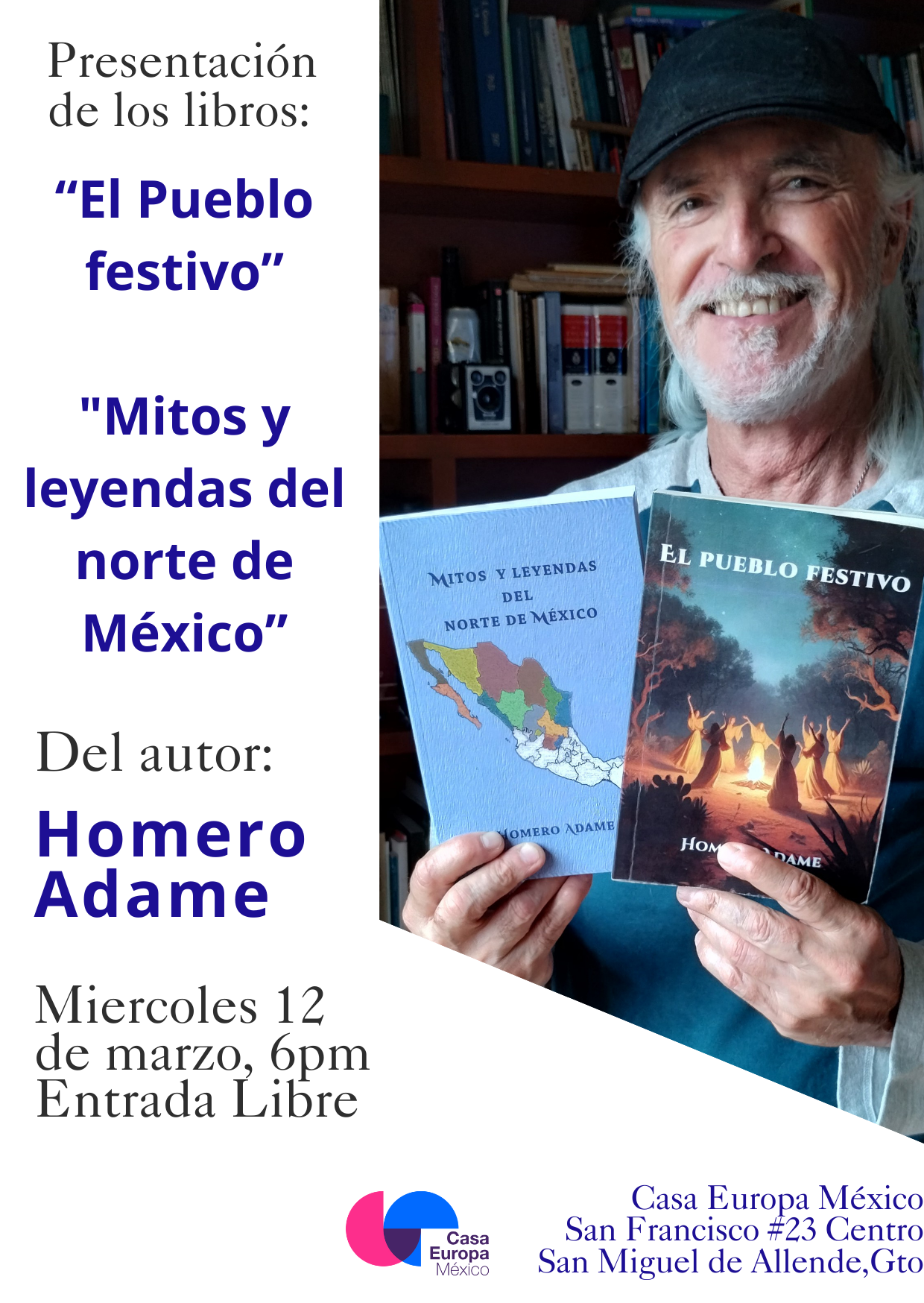 Homero Adame es un escritor que, por azares del destino o por karma, nació en el extinto Distrito Federal y, sin que lo consultaran, creció en Linares, N.L. Allí no tuvo peor remedio que hacer sus estudios de primaria, secundaria y preparatoria. Cuando le dieron alas, vivió un año en Seattle, Washington, estudiando inglés y luego en Ojai, California, donde estudió Psicología en The World University. Más tarde regresó a su ciudad natal para estudiar la carrera de Arqueología en la ENAH (Escuela Nacional de Antropología e Historia) y no graduarse en ninguna. Después volvió a Linares, donde abrió la librería Alpha~Omega y para no aburrrirse porque en aquel tiempo casi nadie leía libros en aquel pueblo nada mágico aceptó un trabajo insustancial como maestro de Inglés en Conalep, Plantel Linares, de 1981 a 1983. Le agarró gusto a eso de ser maestro y lo contrataron en la Universidad Autónoma de Nuevo León, en lo que eran los institutos de Geología y Silvicultura, los cuales se convirtieron en facultades de Ciencias de la Tierra y de Ciencias Forestales y Homero Adame fue maestro de Inglés y Coordinador de Lenguas en ambas. Entre 1986 y1987 sus inquietudes lo animaron a tomarse un año sabático, por lo que se fue a París, Francia, donde aprendió francés. Tiempo después reforzaría el italiano que medio había estudiado en sus años en el desaparecido D.F. Con otra visión de su vida regresó a Linares. En 1989 comenzó a colaborar para la Editorial México desconocido, escribiendo artículos de viaje y tomando fotografías que se han publicado en las diferentes revistas de dicha editorial. Como seguía laborando en la UANL, tomó cursos especializados de la Universidad de Cambridge, Inglaterra y en 1991 recibió el título COTE (Certificate for Overseas Teachers of English). Después abrió LIBRAEL, una academia de Inglés en Linares, de la cual fue director de 1992 hasta que la cerró en (quebró con la crisis de) 1995. Un año crucial en su vida fue 1996, cuando junto con su esposa decidió abandonar Linares y el entorno familiar o zona de confort de una vez por todas. Se mudaron a San Luis Potosí y él se tomó un sabático para dedicarse a escribir, a viajar, a disfrutar de la vida sin tantas obligaciones más que las propias. Ese sabático no ha terminado... Ha recorrido todos los rincones del Estado para recopilar historias y tomar fotografías. Desde entonces ha viajado por todas las regiones de México y recorrido muchísimos rincones de Europa. Durante su tiempo en San Luis Potosí ha colaborado asiduamente con la Secretaría de Turismo, aportando sus conocimientos de la entidad, dígase acerca de fiestas, de tradiciones o de lugares turísticos, además de escribir los textos para el portal de Internet de dicha Secretaría. Cabe mencionarlo, se le considera como experto y asesor en la Secretaría de Cultura para proyectos y programas relacionados con la Región Altiplano, las culturas populares y el Fomento a la Lectura. También ha sido asesor de Graphstyle Publishers y corrector de estilo para la Editorial Leirem, S.A. Desde hace siete años él y su esposa Pat Grounds radican aquí en San Miguel de Allende donde ambos han sido parte del Consejo de la Fundación Casa Europa. Homero Adame ha publicado más de 30 libros, de los cuales 20 abordan el tema de la tradición oral (leyendas, mitos, historia oral, anecdotarios, la oralidad). Por ello se le conoce como “el hombre leyenda” o el “arqueólogo de la conciencia colectiva”, profesión inexistente, inventada para él porque, más que venirle "como anillo al dedo" o como "fantasma al panteón", le acomoda como "excavador de historias". Además, en los últimos años ha estado editando libros ajenos, haciendo el diseño editorial y dejándolos listos para imprenta o para subirse a alguna plataforma digital, como lo ha hecho con muchos de los suyos en Amazon. Y hoy nos presenta sus más recientes trabajos: Mitos y leyendas del norte de México, para el cual incluyó una leyenda de San Miguel, y El pueblo festivo, su primera novela.